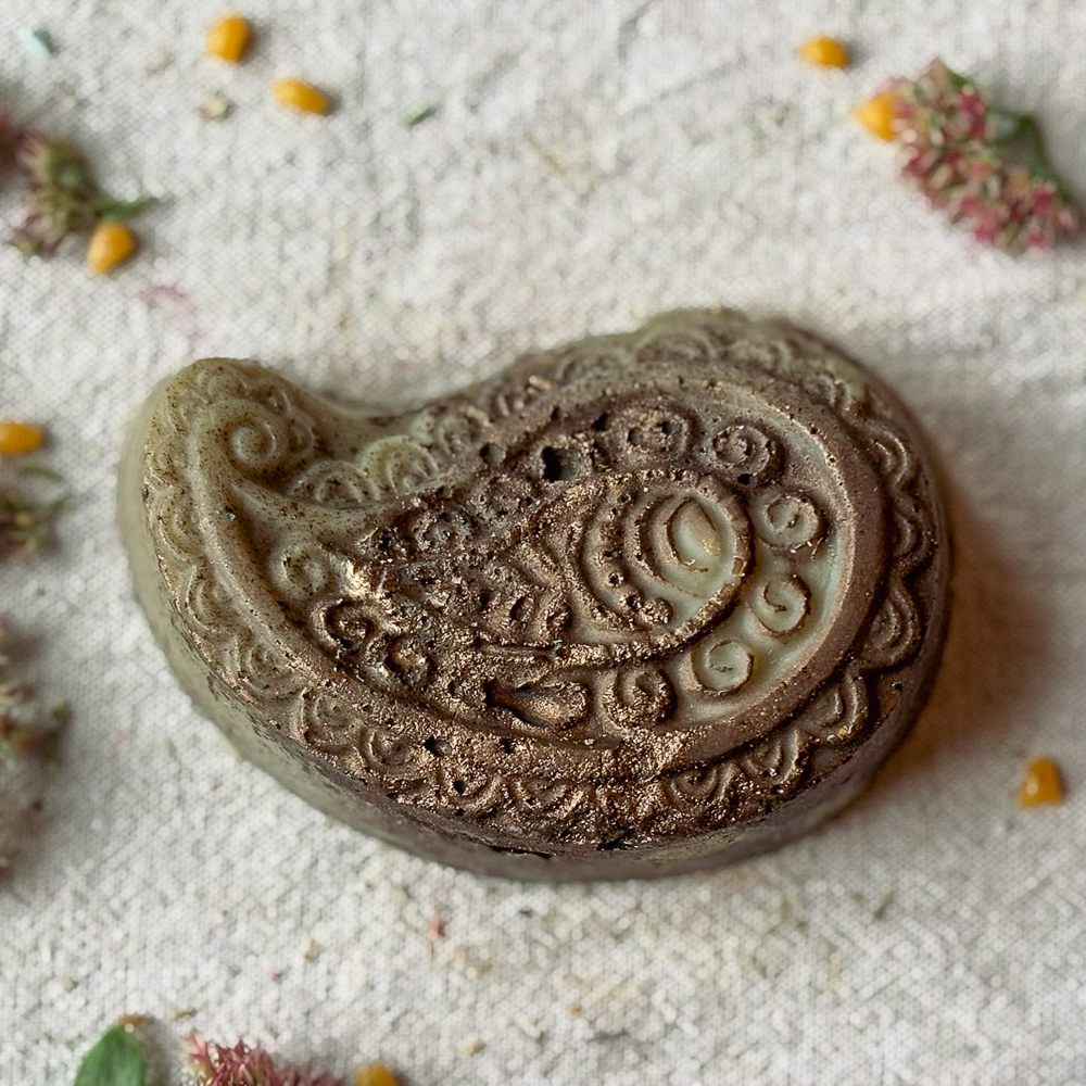 Eine handgemachte Haarseife mit rotem Hennapulver und pflegenden Ölen.