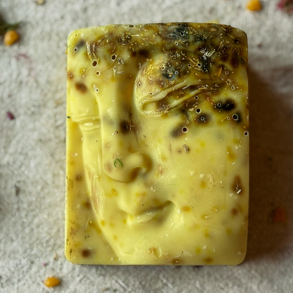 Inhaltstoffe: Ringelbumenölauszug aus Olivenöl, Kokosfett, Kakaobutter, Rapsöl der Ottensteiner Ölmühle, Ringelblumentee, NaoH, Ringelblumen getrocknet