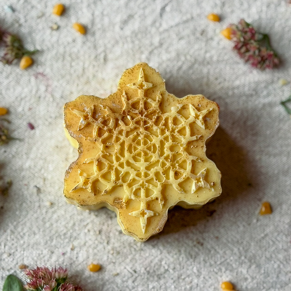 Eine handgemachte Duschseife mit feinen Winterdüften. Reichhaltige Öle und Fette pflegen die trockene Winterhaut schon ab der ersten Benutzung.